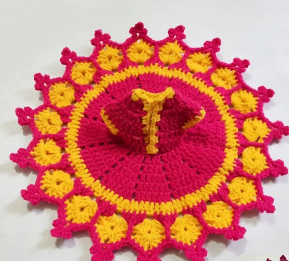 Dress your Ladoo Gopal idol in this stunning handcrafted crochet dress, beautifully designed in a combination of bright pink and yellow. The intricate detailing and elegant border make it a perfect choice for festive occasions, Janmashtami, and daily worship. Made from high-quality soft yarn, this outfit ensures a comfortable and graceful look for your deity.